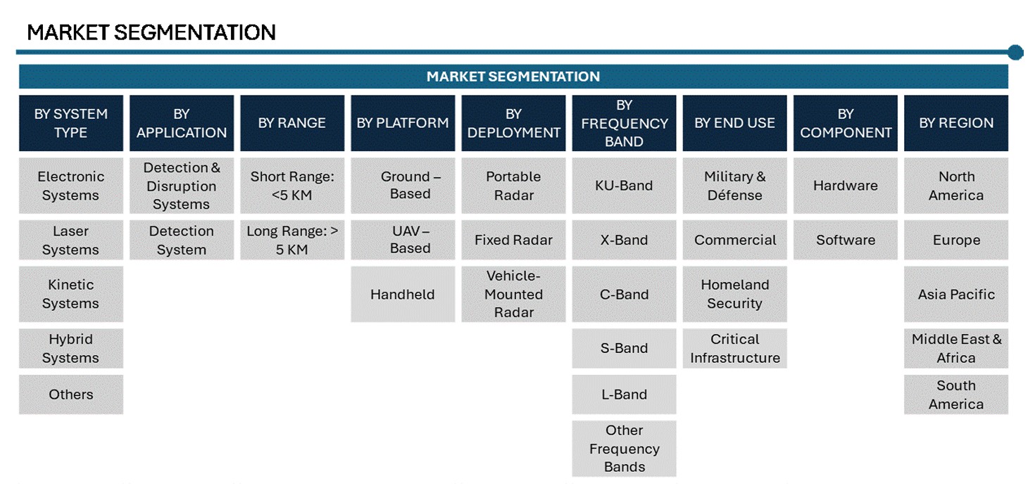 • Integration of AI/ML, multi-sensor arrays (Radar, RF, optical), and scalable ground-based platforms enhance effectiveness