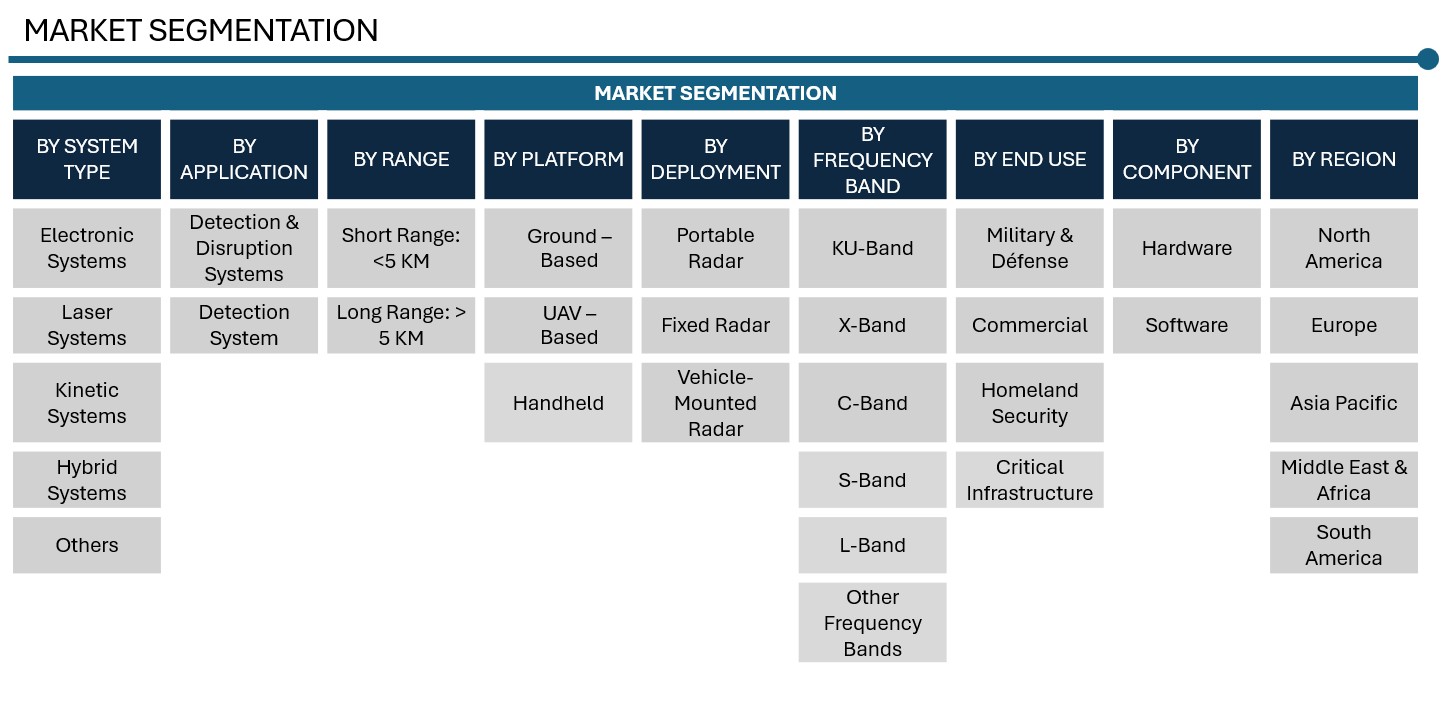 ANTI DRONE MARKET SIZE & SHARE BY SYSTEM TYPE (ELECTRONIC, LASER, KINETIC, HYBRID), BY APLICATION (DETECTION & DISRUPTION, DETECTION), BY RANGE (5KM), BY PLATFORM (GROUND BASED, UAV BASED, HANDHELD), BY COMPONENT (HARDWARE, SOFTWARE), BY END USE (MILITARY & DÉFENSE, HOMELAND SECURITY, COMMERCIAL), BY FREQUENCY BAND, AND BY REGION & COUNTRY – FORECAST TO 2032