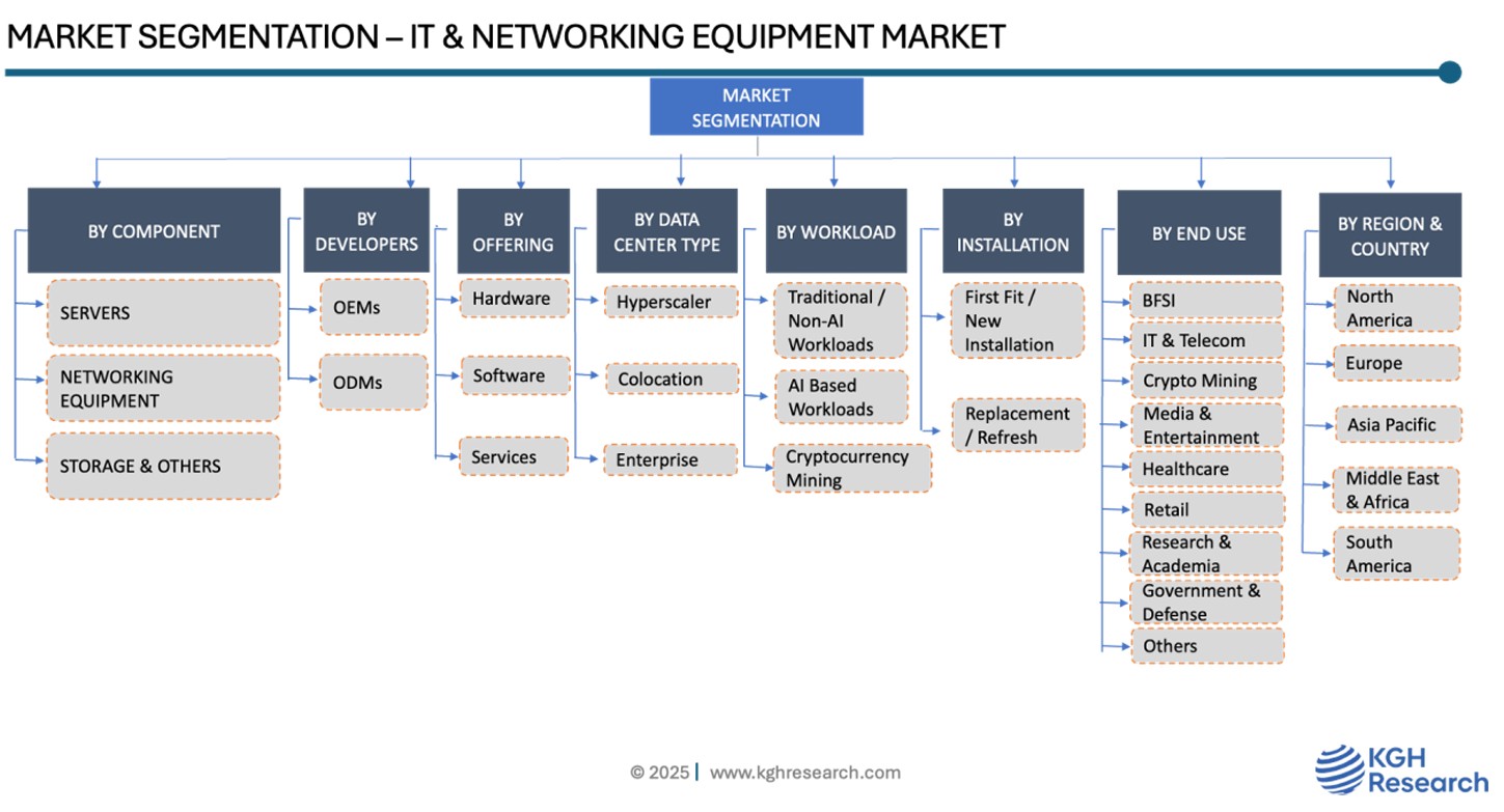 DATA CENTER IT & NETWORKING EQUIPMENT MARKET SIZE & SHARE BY COMPONENT (SERVER, NETWORKING EQUIPMENT, AND STORAGE), BY DATA CENTER TYPE (HYPERSCALER, COLOCATION, AND ENTERPRISE), BY WORKLOAD (AI BASED, NON-AI BASED), BY DEVELOPER (OEMs AND ODMs), BY END USE, BY HARDWARE, SOFTWARE, AND SERVICE, BY INSTALLATION (FIRST FIT AND REPLACEMENT / REFRESH), AND BY REGIONS & KEY COUNTRIES – FORECAST TO 2035
