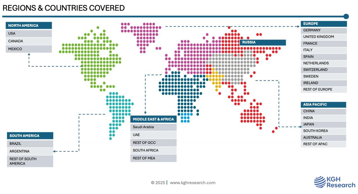 US, Canada, Mexico, UK Germany, France, Italy, Ireland, Sweden, Netherlands, Switzerland, Spain, Russia, China, India, Japan, Singapore, South Korea, Thailand, Indonesia, Australia, Malaysia, Saudi Arabia, UAE, South Africa, Brazil, Argentina, and Rest of the World
