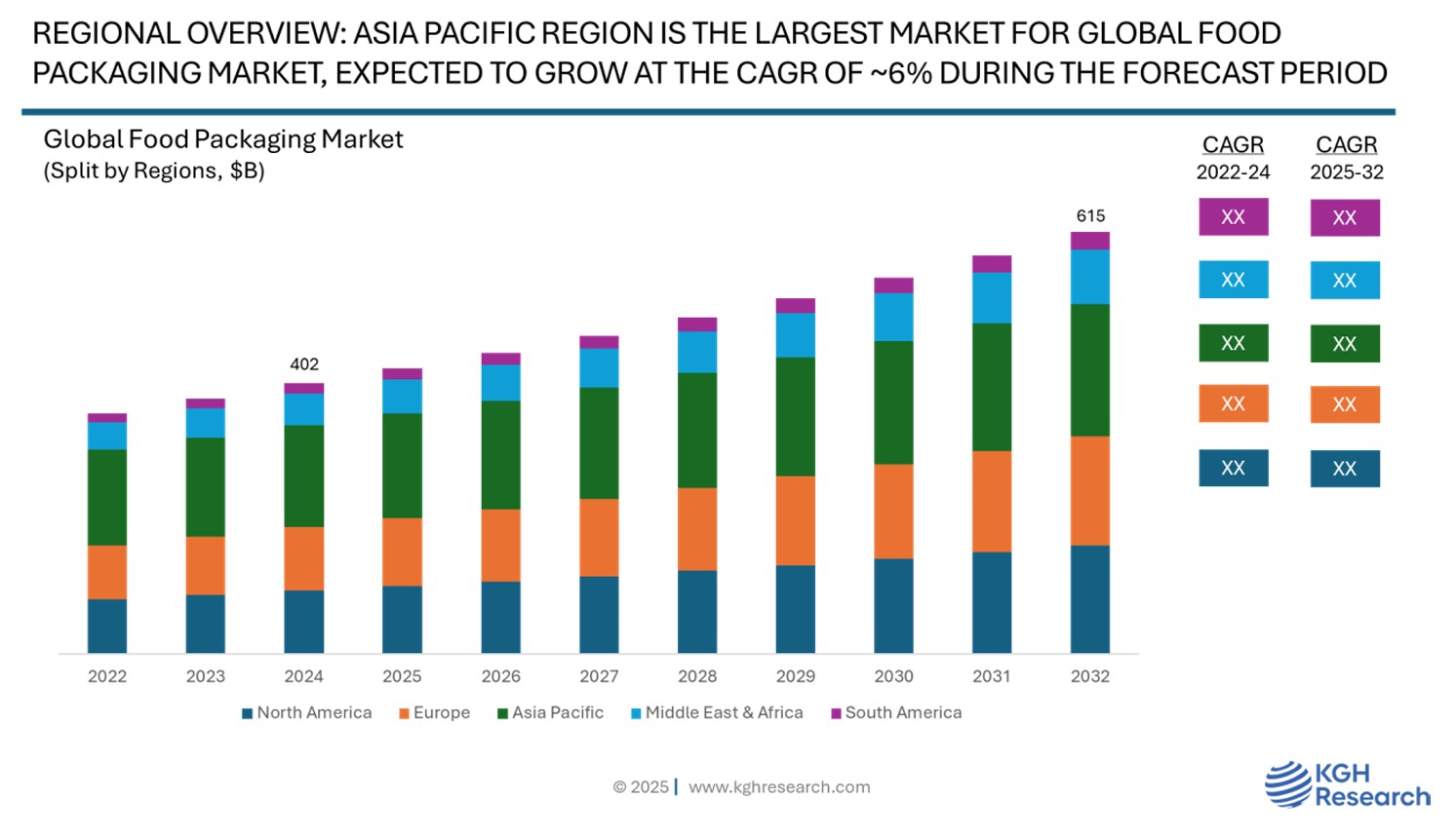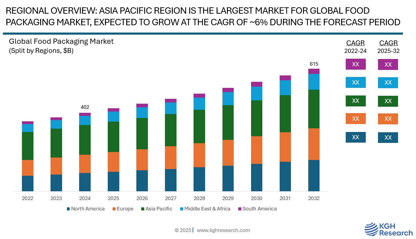 Market Overview: The global food packaging market was valued at approximately USD 402 billion in 2024 and is projected to grow at a compound annual growth rate (CAGR) of 5.4% from 2025 to 2032 to reach USD 615 billion by 2032. The global market for food packaging is largely propelled by the increasing demand for convenient, ready-to-eat, and processed food items, especially in urban environments and fast-paced lifestyles. Heightened consumer awareness about food safety, hygiene, and extending shelf life has led to a notable rise in the use of advanced packaging solutions that safeguard food from contamination and spoilage. Furthermore, the growth of online food delivery services and e-commerce grocery platforms has increased the need for sturdy and secure packaging types. Innovations in technology, such as active, smart, and sustainable packaging, are also becoming more popular due to environmental concerns and regulatory demands for eco-friendly options. The expanding middle-class population in developing nations, along with shifting dietary patterns and elevated disposable incomes, is additionally driving the substantial growth of the food packaging sector globally.