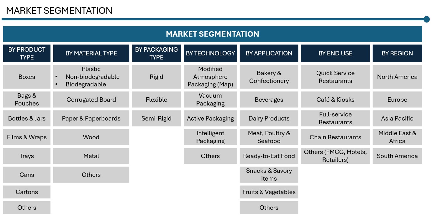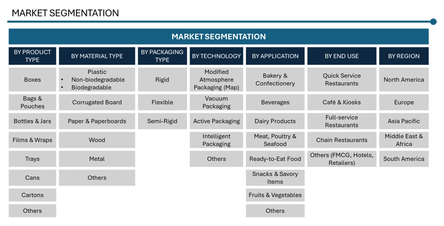 FOOD PACKAGING MARKET SIZE & SHARE BY PRODUCT TYPE (BOXES, BAGS & POUCHES, BOTTLES & JARS, TRAYS, CANS, CARTONS), BY MATERIAL TYPE (PLASTIC, CORRUGATED BOARD, PAPER & PAPERBOARD, WOOD, METAL), PACKAGING TYPE (RIGID, FLEXIBLE, SEMI-RIGID), TECHNOLOGY (MAP, VACUUM PACKAGING, ACTIVE PACKAGING, INTELLIGENT PACKAGING), BY APPLICATION, BY END USE AND BY REGION & COUNTRY – FORECAST TO 2032