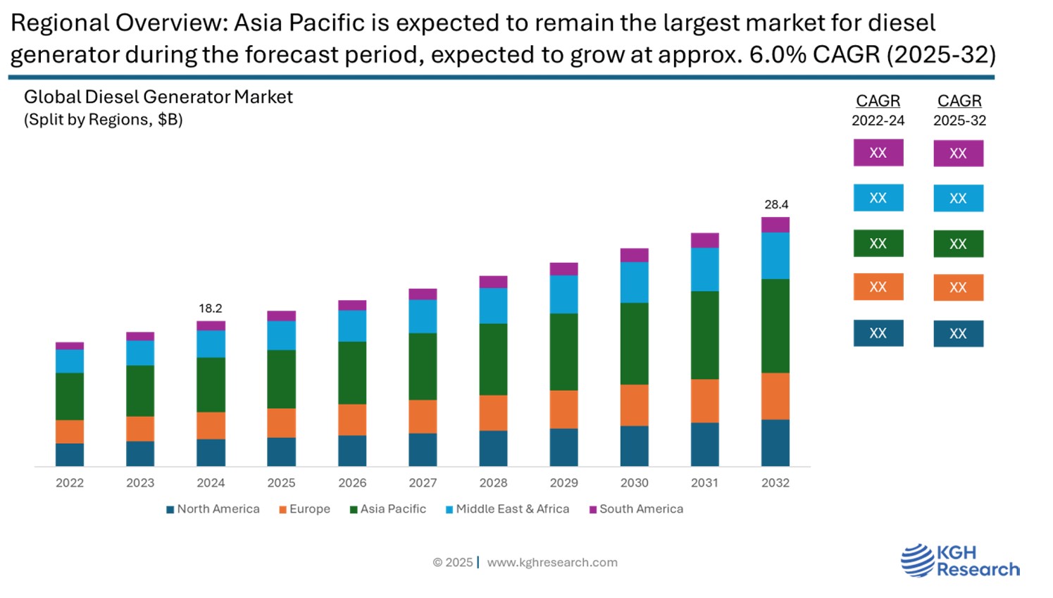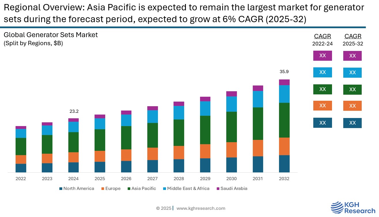 Market Overview: The global generator market was valued at approximately USD 23.2 billion in 2024 and is projected to grow at a compound annual growth rate (CAGR) of 5.6% from 2025 to 2032 to reach USD 35.9 billion by 2032. The global generator market is experiencing significant growth and is driven by the increasing demand for reliable power supply in areas with unstable or underdeveloped grid infrastructure. Rapid urbanization and large infrastructure projects in emerging economies are boosting the need for backup and standby power, especially in the commercial and construction sectors. Furthermore, the rapid growth of data centers, telecommunication, and IT infrastructure is fueling market expansion since continuous power is essential in these areas. The increasing frequency of power outages, combined with the move toward fuel-efficient, low-emission, and hybrid generator solutions, is also speeding up market adoption in both developed and developing regions.