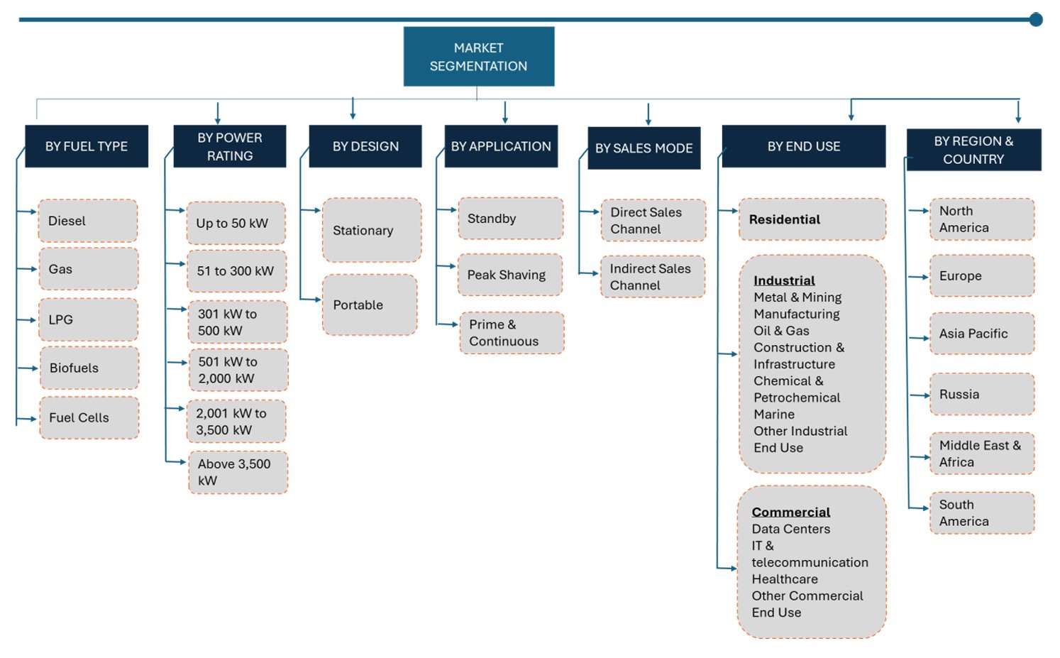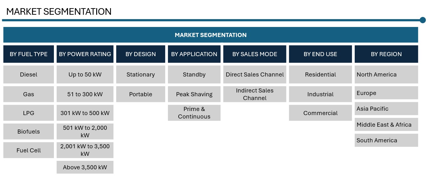 GENERATOR MARKET SIZE & SHARE BY FUEL TYPE (DIESEL, GAS, BIOFUELS, LPG, FUEL CELLS), BY POWER RATING (UPTO 50 KW, 51 TO 300 KW, 301 KW TO 500 KW, 501 TO 2,000 KW, 2,000 TO 3,500 KW, ABOVE 3,500 KW) BY DESIGN (STATIONARY, PORTABLE) BY APPLICATION (STANDBY, PEAK SHAVING, PRIME & CONTINOUS) BY SALES MODE (DIRECT, INDIRECT) BY END USE (RESIDENTIAL, INDUSTRIAL, COMMERICIAL) AND BY REGION & COUNTRY – FORECAST TO 2032