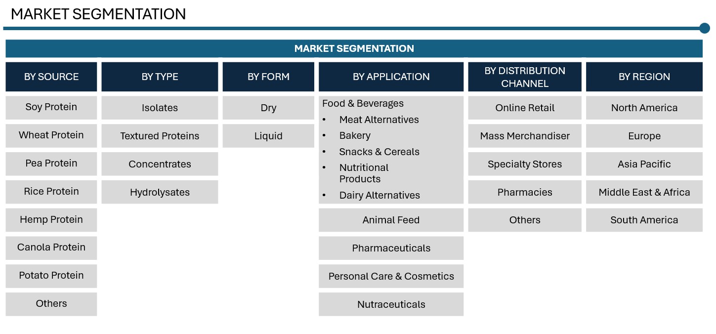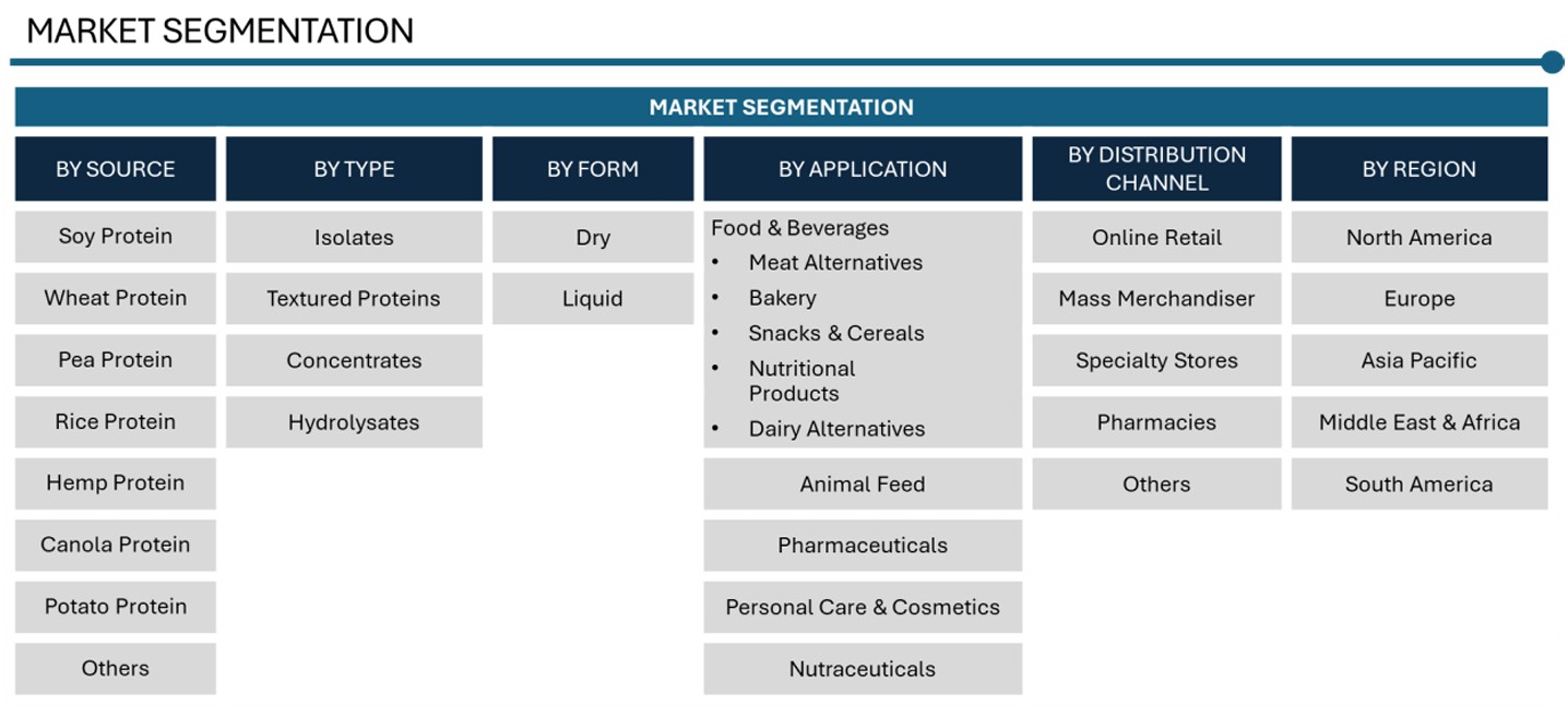 PLANT-BASED PROTEIN MARKET SIZE & SHARE BY SOURCE (SOY, WHEAT, PEA, RICE, HEMP, CANOLA, POTATO), BY TYPE (ISOLATES, TEXTURED PROTEINS, CONCENTRATES, HYDROLYSATES), BY FORM (DRY, LIQUID), BY DISTRIBUTION CHANNEL (ONLINE RETAIL, MASS MERCHANDISER, SPECIALTY STORES, PHARMACIES, AND OTHERS), BY APPLICATION (FOOD & BEVERAGES, ANIMAL FEED, PHARMACEUTICALS, PERSONAL CARE & COSMETICS, NUTRITIONAL SUPPLEMENTS), BY REGION & COUNTRY – FORECAST TO 2032